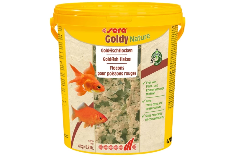 Sera Goldy Nature ist das Hauptfutter ohne Farb- und Konservierungsstoffe für kleinere Goldfische und ihre Zuchtformen wie z. B. Sarasa, Shubunkin oder Schleierschwänze und andere Kaltwasserfische. Seine hochwertige Ressourcen schonende Proteinquelle ist Insektenmehl. Dieses leicht bekömmliche Fischfutter entsteht durch das ausgewogene Verhältnis von pflanzlichen zu tierischen Inhaltsstoffen die ein gesundes Wachstum und prächtige Farben fördern. Die formstabilen Flocken eignen sich für an der Oberfläche fressende Kaltwasserfische und trüben das Wasser nicht.
