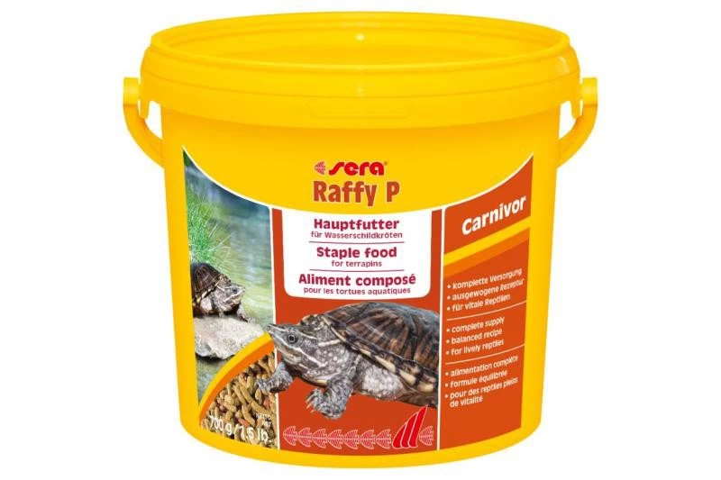 Sera Raffy P aus schwimmendem, schonend hergestelltem Granulat ist das Hauptfutter für Fleisch fressende Reptilien wie Wasserschildkröten. Die schmackhafte und ausgewogene, Komposition mit tierischen und ebenfalls benötigten pflanzlichen Inhaltsstoffen zeichnet sich durch optimal verwertbares Protein, leicht verdauliche Kohlenhydrate sowie einem hohen Gehalt an Omega-Fettsäuren aus. Die grundlegenden Bedürfnisse der carnivoren Reptilien werden sicher abgedeckt. Vitalität und gesunde Entwicklung werden gefördert.